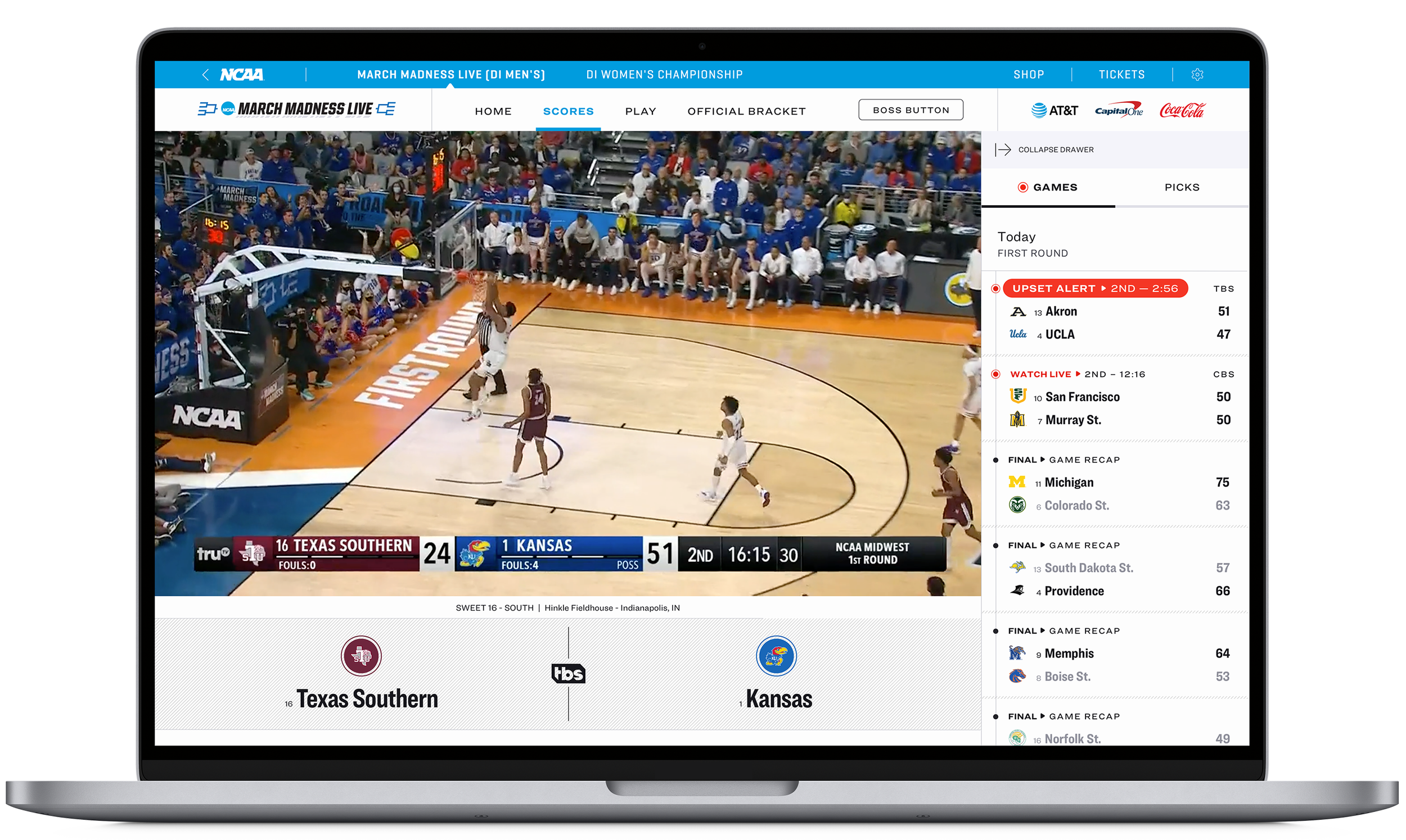 The March Madness Live app offers up-to-the-moment coverage through live video, scores, and real-time alerts. Fans can stay connected to the tournament at home or on the go.
